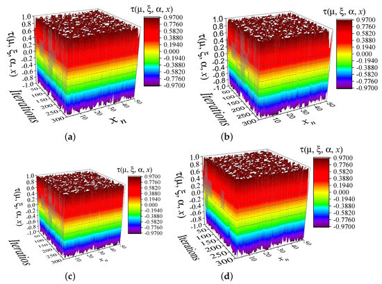 In contrast, A = generates chaotic sequences with better properties. Therefore, we considered the same 50 initial conditions, each iterated 300 times. It can be observed in Figure 6 that the chaotic orbits appear within the interval −1 to 1. This indicates a substantially evolved chaotic behavior over 300 iterations using an ensemble of 50 initial conditions.