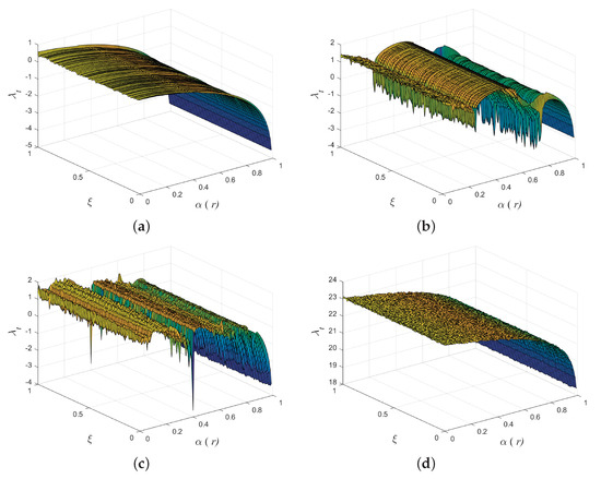 Lyapunov exponent of SM-MBCM for the combination of and using different values of (a) , (b) , (c) , and (d) .