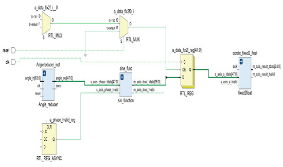 The angle is reduced using the periodicity of , normalizing it to the range . This is performed by subtracting the complete cycles: , which results in the angle being within the range . Finally, an adjustment is made for using the periodicity of the sine function, as follows: if , then ; conversely, if , then . This provides the angle output, , in Q3.45 format. As for the instance, it evaluates and generates the result in Q2.46 format, considering values in the range . An approximation of the design is shown in Figure 10.