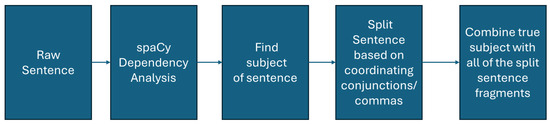 The second for-loop goes through a few steps looking at the dependencies within the sentence (using the spaCy dependency parser). First, it checks whether or not the current noun chunk contains a subject for the sentence via the is_subj function. If it is a subject, then it is assigned to the true_subj variable. We then continue through the loop. After this, the function get_all_right_children is used to create a string of all of the words in the right subtree of the root verb (or the verb that the subject is the immediate child of). Finally, this new string is given to the split_sent function. This split_sent function “splits” up the sentence by coordinating conjunctions, commas and ending parentheses (which does assume that parentheses hold additional information). To go into some detail, given a sentence, it copies over each word into a new sentence segment until it sees one of the above-mentioned conjunctions or commas, at which point it adds the current segment to an output list and begins to build the next segment from the sentence. These steps are justified by rules CC and CD with the uncertain variant (excluding the word “possibly” in parentheses) from the Results section. The resulting list of sentence segments is then passed to the third for-loop. The third for-loop brings together the true_subj and the segments obtained from the split_sent. The word “is” was inserted into the string.