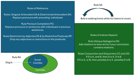 There are other forms of inference rules we will describe as needed in the following sections, but we will focus on particular rules and gleanings from the natural and Aristotelian logic literature that we will apply to real sentences from datasets to give us results. Finally, we will then combine all of the rules and other natural language processing (NLP) tools to give us the rest of the results.