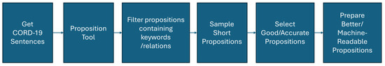 We will discuss in this subsection the code and approach used for the proposition tool used in the Results. The code can be found in biomedical_text_processing\biomedical_processing.py in the Supplementary Files, in the zip file biomedical_text_processing.zip. All other code is there as well. The general flow for the approach is diagrammed in Figure 1, which visualizes the process taken to process each sentence.