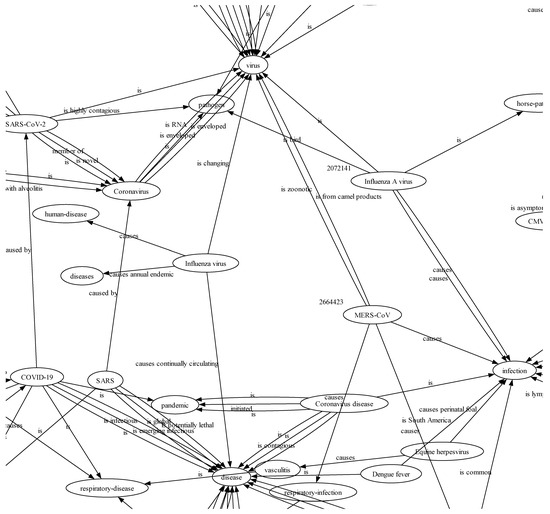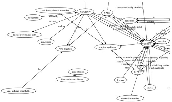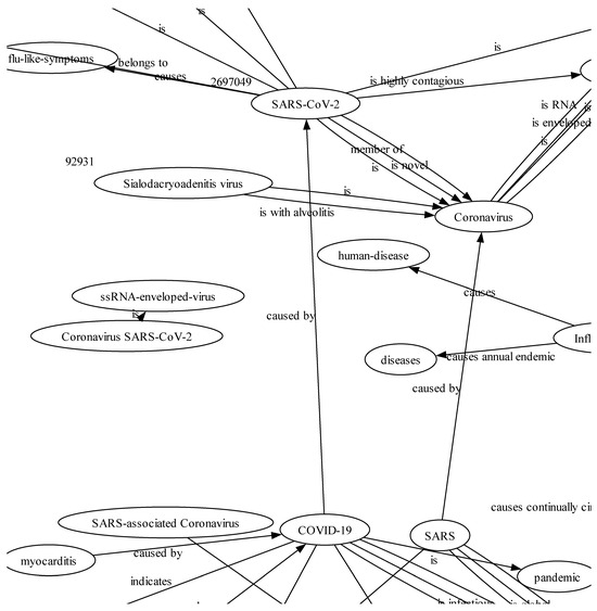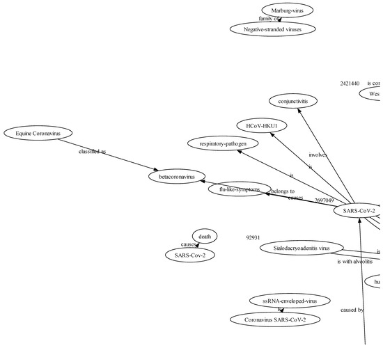 Specifically in the field of bio-ontologies for COVID, our method for building ontologies is advantageous over prior approaches in two respects: first, its greater scalability than comparable manually built COVID ontologies, and also its accuracy as compared to fully automatic NLP-built COVID ontologies. The scalability of the method presented in this paper is reasonably high as there was little manual post-processing and much of the processing of text data was carried out automatically using NLP techniques. The robustness of the proposed methods is demonstrated by the performance of the method with little to no prior background knowledge built in. The accuracy was 93.6 percent (6.4 percent error). In comparison with manual entry of bio-ontologies, which is by far the dominant approach (as used in [16,17,18]), our approach is vastly more scalable (though obviously less accurate). Compared to entity-based NLP analysis methods [19], our accuracy is higher, as it takes into account common grammatical structures to generate relations. In particular, there were three different works describing a COVID-related bio-ontology that were based on manual entry of the ontology [16,17,18]. When compared to CIDO [16,17], we have a similar subject matter with regards to phenotype, genetics information, various attributes, symptoms, etc., but do not cover specific mechanistic information for drug discovery. In comparison to Domingo-Fernandez et al. [18], we cover different things: the diseases and the related viruses cross-linked with genetics information, as opposed to specific protein/mechanistic cause information related to COVID. However, we have a solution based on text mining, which is not manually entered. The COVID ontology given there is vast but is based on manual encoding rather than the automatic (with human correction/supplementation) NLP-based methodology given here. The evaluation of the resulting ontologies would be based on the scientific accuracy of the underlying relationships in the ontology. As the scientific accuracy level for the manually entered ontology is very high (since the ontology was given based on scientific literature alone), our ontology’s high accuracy despite automation is important. We found the accuracy of our ontology based on manually scoring the discovered entities and relationships was 93.6 percent (error rate: 6.4 percent). Another approach to a COVID bio-ontology for drug discovery was based on using ontology-informed named entity recognition NLP analysis [19], and is thus very scalable (even more than our approach since we used minimal manual post-processing). However, the entity-based NLP-built ontology has a relatively high rate (6–22 percent) of misses or false alarms for the entities identified in the knowledge graph.