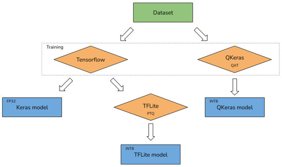 PTQ consists of applying the quantization process as a post-processing step after the training of the model has been completed. For example, TensorFlow Lite (TFLite) [23], a popular tool part of the Tensorflow Deep Learning framework [24], supports PTQ for various precision methods, including INT8. With QAT, on the other hand, models are trained with reduced precision, allowing the network to learn in a quantized environment from the start. This approach often leads to more robust (also from adversarial attacks [25]) quantized models, as the network is optimized for lower precision throughout training. QKeras [26,27,28], an API drop-in replacement extending the Keras framework, was designed for quantization, supporting only QAT, offering a wide range of layers and activation functions optimized for quantization. QKeras allows users to create heterogeneously quantized integer or fractional deep learning models by simply replacing the Keras layers of the original model with the corresponding QKeras versions.
