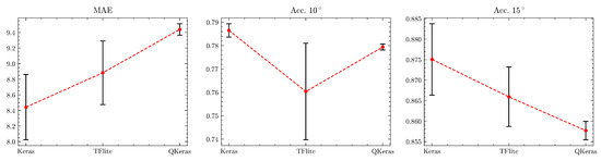 All the models considered by this benchmark are provided in three versions. The first version is full-precision fp32, which is obtained by five-fold validation training on the training set using Keras-tensorflow [24]. The second version is INT8, and it is obtained through PTQ using TFLite [23]. The last version is also in INT8, and it is obtained through QAT using the QKeras [26,27,28] framework. The ML framework previously described is illustrated in Figure 1. As the five-fold validation was adopted, five different models were saved for each NN topology. In SHL and PAMAP2, where there are different carry positions for the IMU sensors, a different model was trained for each position. Table 2 reports the average accuracy (on the five folds) of the Keras, TFLite, and QKeras versions of the Dense and CNN models on the SHL and PAMAP2 datasets. A trend in the accuracies reported is noticeable. Keras tends to always perform the best, followed by QKeras, while TFLite tends to perform the worst. In only one case, i.e., CNN on PAMAP2 with the hand as the carry position, QKeras performed worse than TFLite, by 1.6%. The reasons behind such result will be the subject of further investigations. Nevertheless, the higher range of gyroscope and accelerometer data coming from hand movements regarding the ankle and chest could play an important role in influencing this result, considering the quantizations of activations and weights, which are susceptible to high ranges. Despite this corner case, the superiority in terms of the accuracy of QAT in comparison with PTQ was confirmed by the reported results. Input data standardization was omitted to simplify the pipeline, as the model was intentionally designed to process raw sensor signals directly without any preprocessing steps. Future work could explore incorporating preprocessing techniques to assess their impact on model performance. Concerning NINAPRO DB8, the regression performance of the TCN was tested with the same metrics adopted in the original paper [43], namely a mean absolute error (MAE) and an accuracy at 10° and 15°, respectively. The latter is calculated by defining each correct prediction within 10° and 15°, respectively, regarding the ground truth. The metrics and their standard deviations are reported in Figure 2. In particular, the Keras, TFLite, and QKeras versions of the TCN show, respectively, a MAE of 8.44°, 8.88°, and 9.4° with, respectively, 0.42°, 0.41°, 0.07° standard deviations, an accuracy at 10° of 78.6%, 76%, and 77.9% with standard deviations of 0.003%, 0.021%, and 0.001%, respectively, and an accuracy at 15° of 87.5%, 86.6%, and 85.8% with standard deviations of 0.009%, 0.007%, and 0.002%, respectively. To assess the statistical significance of these results, a one-way ANOVA was performed for all three metrics. The analysis yielded F(2, 12) values of 8.6 for the MAE, 5.03 for accuracy at 10°, and 6.8 for accuracy at 15°, corresponding to p-values of 0.005, 0.026, and 0.01, respectively, thereby ensuring statistical significance. In contrast with the macro-trend observed in SHL and PAMAP2, QKeras performed worse than TFLite regarding its MAE by approx. 0.5° and by less than 1% at an accuracy of 15°. Nevertheless, the under-performance of QKeras with reference to TFLite is marginal, and it still performed better than TFLite on one metric, at an accuracy of 10°. The results could be further improved by applying EMA post-processing, as in [43]; however, as it is not part of the TCN topology, it has not been considered by this benchmark.