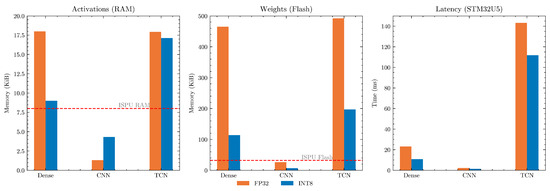 The memory footprint of the NNs was divided into two contributions, activations and weights, as they reside in two different types of memories: data RAM (8 KiB) and program RAM (32 KiB), respectively. Moreover, there are also contributions due to the software library footprints. However, these were neglected as they are software- and hardware-dependent, undermining the generalizability of this benchmark. To calculate activation and weight memories, the Keras and TFLite versions of the NNs were profiled with the latest version of the ST Edge AI Unified Core Technology tool freely available online (https://stm32ai-cs.st.com/home, accessed on 21 October 2024). Lastly, the inference latency was measured using the latter tool on the STM32U5 MCU. The results are reported in Figure 3, where the ISPU’s data RAM (8 KiB) and program RAM (32 KiB) are highlighted and available. Beware that the PAMAP2 version of the Dense and CNN models was used as it has a greater number of neurons at the output of the SHL dataset, i.e., 12 vs. 8, representing a higher size and latency. The activations’ memory for Dense occupies 18 KiB (FP32) and 9 KiB (INT8); 1.31 KiB (FP32) and 4.31 KiB (INT8) for the CNN model; and 17.94 KiB (FP32) and 17.13 KiB (INT8) for the TCN model. The weights’ memory footprint for Dense encompasses 465 KiB (FP32) and 114 KiB (INT8); 26.3 KiB (FP32) and 6.84 KiB (INT8) for the CNN model; and 492 KiB (FP32) and 197 KiB (INT8) for the TCN model. Lastly, the inference latency is reported to be 23.17 ms (FP32) and 10.78 ms (INT8) for the Dense model; 2.231 ms (FP32) and 1.54 ms (INT8) for the CNN model; and 143.3 ms (INT8) and 111.8 ms (INT8) for the TCN model. The INT8 versions of the models always outperformed their FP32 counterparts in terms of memory and latency reductions, except for the activations for CNNs. This result is probably attributed to the various mechanisms and optimizations that happen at a code-generation level in the employed tool. For the Dense model, INT8 reduces activations’ memory by half, whereas in the case of TCN, the memory is left almost untouched. The reasons for this could be attributed to the factors that were mentioned previously. Regarding weights, the CNN model approximately has a 20× reduction with reference to its Dense version and the TCN architecture, which has a similar weight footprint to Dense. This is due to the higher number of parameters involved in a Dense layer compared to a Conventional one. As a matter of fact, the Dense model has 116 thousand parameters, the TCN 127 thousand, and CNN has only 6.5 thousand of them. Also, the TCN uses Convolutional layers; however, it is far more deeper than the CNN architecture. This aspect emerges prominently in the latency analysis. The TCN requires approx. 10× more time than Dense and 100× more time than the CNN model. While the Dense and CNN models have the same depth, CNN requires 10× less time. This can be attributed to several factors, which depend on SW and HW optimizations. Observing the limits imposed by the ISPU [35] sensor, only the CNN architecture fulfilled them. Additionally, considering the overhead of software libraries, only the INT8 version of the CNN met the requirements. Its latency was measured directly on the ISPU hardware, resulting in 128.5 ms. The higher latency regarding the values measured on the STM32U5 could be attributed to the aspects related to hardware performance and clock frequency. This indicates that CNN versions should be preferred concerning the Dense model as the number of parameters is drastically lower, with them having the ability to fit within the tight memory requirements of the sensor. The TCN is still not able to fit within the ISPU requirements as it is intrinsically deep, due to the complex nature of its tasks.