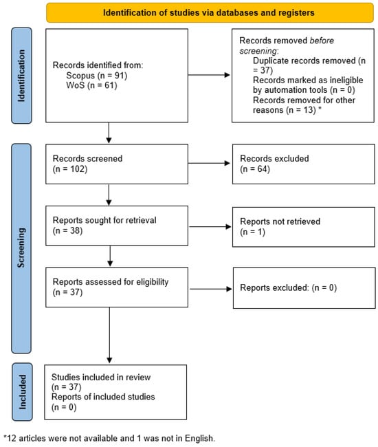 At the end of this process, 37 articles were selected and 65 were excluded (see Table 1 and Figure 1). These 37 articles were ultimately marked as “Yes” for the basis for this SLR (see Table 2 for the complete list of references).