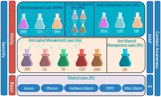 As explained in Ref. [13], ReM-AM (Figure 1) is an adaptation of the middleware AmICL [15], which includes a layer related to acoustic management to make the system suitable for acoustic recognition, among other tasks. This layer, called the audio management layer (AML), has a component for the characterization and categorization of sound events (collecting audio data, CAD), which creates metadata and defines their properties. Another component is used for sound recognition and smart analysis, employing information from the interactions in the environment (interaction system–user–agent ISUA); and the last component is used for the decision-making (DM) process to adapt and optimize an SE, according to its acoustic necessities or deficiencies.