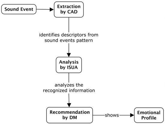 As shown in Figure 4, when a sound event is identified, the CAD component extracts the information from it and identifies the descriptors explained in Table 1. That information is sent to the ISUA for classification and analysis, giving the result to the DM module, where the system can determine the prevalent emotion in the SE. The tasks in the autonomic cycle are as follows: