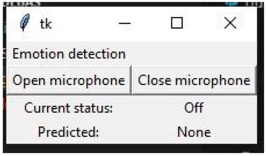 The interface for the system is very simple (see Figure 5), only displaying whether or not the emotion detection system is available (open and close the audio input), along with the emotion predicted. Specifically, the interface allows for the opening of the microphone to listen to ambient sound. To do so, the Current Status button must be set to “on”. Then, the system captures information about the sound events based on the descriptors shown in Table 1. When an emotion is identified, the status of the Predicted field changes from “None” to “Predicted” (the predicted information, with its descriptors, is stored in a .cvs file called “predicted-emotion”).