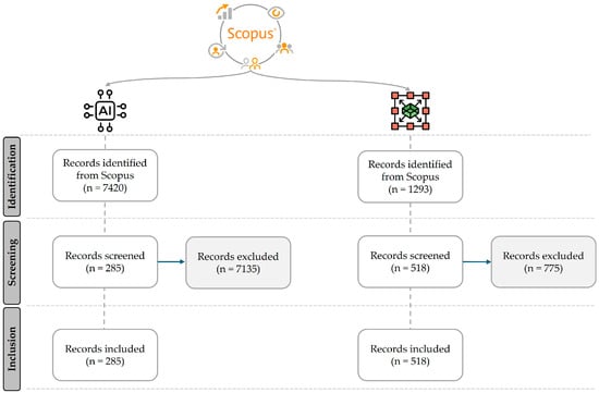 - In the current research, the initial collection of contributions of interest (identification) was discovered by consulting the Scopus database on 31 August 2024, and formulating two independent research questions, one on AI and one on MCDA in relation to assessments in urban contexts. Scopus allows studies to be confined to a certain time range and/or a defined subject of inquiry.