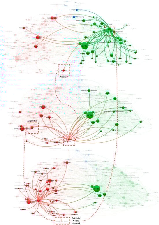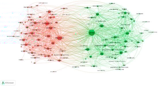 Figure 4’s network shows two distinctly different clusters: the first, represented by red, is more focused on decision-making systems, their objectives, and the optimization logics that are typically employed in the search for ideal solutions; the second, represented by green, is more concerned with characterising the urban area using operational and instrumental methodologies of a multi-criteria matrix, such as risk analysis, fuzzy philosophy, AHP, and the use of geo-referenced systems to foster decision-making in urban areas.