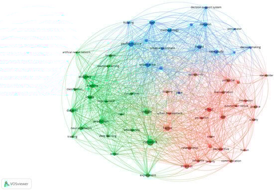 On the other hand, Figure 5’s network illustrates the ambiguity surrounding AI in relation to urban decision-making environments by identifying three theme groupings that are not unduly distinct and antagonistic. Based on the examination of AI-related publications for urban decision-making systems, three theme groupings may be distinguished. The first, green-coloured group, which is arranged from left to right, is primarily concerned with the infrastructure of artificial intelligence (AI), both in terms of the functional relationships between various semantic domains and in managing vast amounts of data so that they are appropriately related to one another for the creation of composite indicators or assessment indices. The second, highlighted in red, demonstrates how artificial intelligence (AI) is connected to users’ participatory dimension through technologies of perception and information usage in the data environment. The smaller one in blue, on the other hand, is related to AI in line with the methodological problem and how it is structured for measuring the performance level of urban settings at various study sizes (building, urban space, and others).