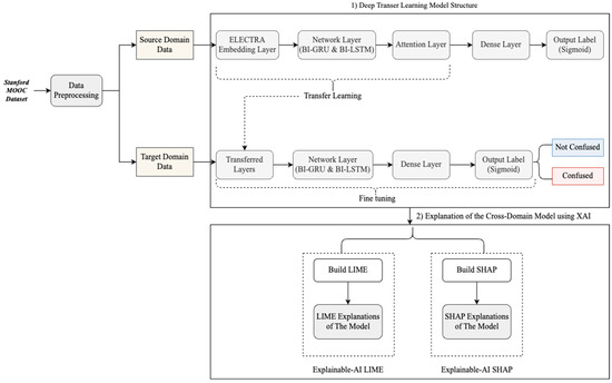 In order to address the research questions and achieve the outlined objectives, the research methodology in this study consists of two distinct phases. (1) Building the deep TL model: This phase involves several steps. It starts with data preprocessing, followed by word embedding. A neural network for the source model is then constructed, utilizing a bidirectional GRU-LSTM architecture with an attention layer. Subsequently, the source network layers, except the output layer, are transferred to the target model. Additional GRU-LSTM layers are added to the target model, followed by fine-tuning of all layers and the inclusion of a dense layer to generate the final output. (2) Unpacking the model: In this phase, two advanced explainable AI models are employed to unveil the model’s predictions and highlight the significant features influencing the decision regarding whether a post is confused or not. The proposed framework’s structure is depicted in Figure 1, and a more detailed breakdown of each phase is provided below.