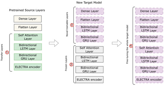 - Source Domain Model: Sequential data inputs are well-suited for RNN models. The emergence of LSTM and GRU models has offered solutions to the vanishing gradient challenges often encountered when training models with long-term dependencies [33,34]. Upon conducting numerous individual experiments with each model, a hybrid approach integrating both GRU and LSTM models yielded superior performance. Furthermore, the inclusion of attention mechanisms exhibited potential in enhancing performance. These mechanisms focus attention on the input sequence that aligns most closely with the predicted feature, rather than assigning uniform attention across all input sentences. In the source model, the encoded text is channeled into the initial network layer—a bidirectional GRU layer comprising 128 hidden units and employing a tanh activation function, coupled with L2 regularization. This is succeeded by a dropout layer with a rate of 0.5. The output of the GRU layer flows through a bidirectional LSTM layer, which also incorporates L2 regularization, featuring 64 hidden units and a tanh activation function. Another dropout layer with the same rate follows suit. Subsequently, the LSTM output is passed to the Keras self-attention layer (https://www.tensorflow.org/api_docs/python/tf/keras/layers/Attention, accessed on 20 June 2023), utilizing the sigmoid activation function for calculating attention weights. Following this, the output is flattened and directed to the ultimate layer—a dense layer equipped with a sigmoid activation function, culminating in the model’s output.