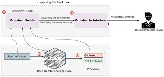 The subsequent phase involves comprehending the predictions made by the implemented cross-domain model. This phase aims to investigate which features were deemed important by the model and contributed to the confusion prediction, along with their corresponding scores. Figure 3 shows an overview of the process of unpacking the black-box model after building the model. In the context of the MOOCs platform, the DTL model classifies the learner’s post as confused or not. After that, the XAI method takes the post, model, and the output label to explain its prediction and justify the results by providing the important features to the instructor.