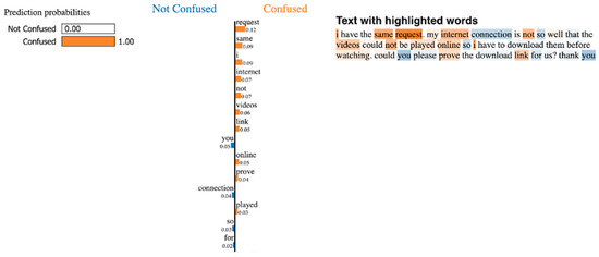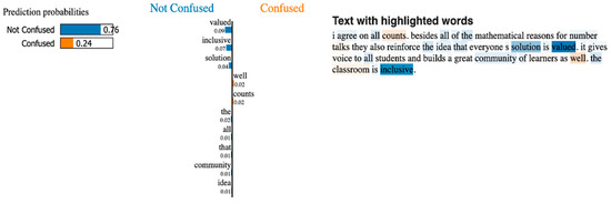 In Figure 4, we present an example from the Humanities domain dataset that demonstrates how LIME explains the EDU–HS model’s prediction. In this specific case, the model correctly predicted the post as confused with a certainty of 100%. The learner expressed a request related to lecture videos, and the top explained features included terms like “request”, “same”, “I”, “internet”, and “not”.