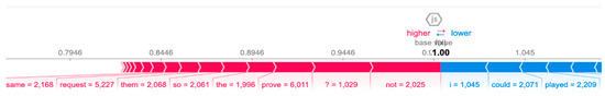 The force plot helps to understand the explainability by representing the features (words) used for generating predictions. Each feature is denoted by an arrow with its corresponding SHAP values. The most crucial features are depicted in the darkest color, indicating the highest value. Less significant features appear in a lighter color. The algorithm calculates values associated with the positive class, which in this context refers to the “confused” class. Features with a high impact, indicating a positive association, are shown in red, whereas features with a low impact or a negative association are represented in blue. Furthermore, a feature with a longer bar signifies a greater contribution.