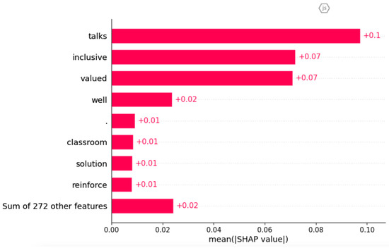 Figure 7 provides different visual representation of the SHAP explanation for the prediction generated by the MED–EDU model. This SHAP bar chart represents the mean of SHAP values that positively affect the prediction, where the feature “talks” indicates the highest value. The sample from the EDU data highlighted crucial features indicative of a non-confused status, namely “inclusive”, “valued”, and “solution”. Remarkably, these features corresponded to the same significant features identified by the LIME explanation.