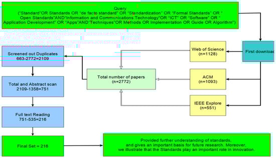 As stated in the introduction, we adopted an SLR to gather the research articles available that supported two concepts: “standard” and “information and communications technology”. The research articles were collected through three well-known digital libraries as follows: (1) Web of Science—which provides multidisciplinary research articles on scientific topics; (2) IEEE Xplore—which deals explicitly with research articles on electrical and electronics engineering; and (3) the ACM digital library, which provides a comprehensive database for computing and information technology.