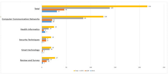The statistics for the various categories listed above for the articles about ICT Standardisation are shown in Figure 3. In the figure, it can be seen that the 216 articles from the three databases were divided into review and surveys (27), computer communication networks standard (126), smart technology standard (19), security techniques standard (19), and health informatics standard (25).