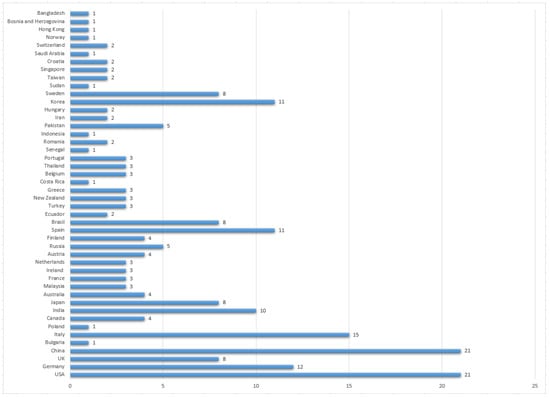 Regarding distribution by author geographical coverage, Figure 5 illustrates the implementation of Standardisation by the utilization of standards in 56 countries and likewise provides the authors’ nationalities. We observed that the relevant studies were conducted geographically, where attempts were made to adopt standards to cover cases in research. The distribution of the 216 articles in standards shows that the most productive authors are from the following countries: USA and China (21); Italy (15); Germany (12); Korea and Spain (11 each); India (10); Brasil, Sweden, Japan, and the UK (8 each); Pakistan, Russia (5 each); Finland, Austria, Australia, Canada (4 each); Portugal, Thailand, Belgium, Greece, New Zealand, Turkey, Netherlands, Ireland, France, Malaysia (3 each); Switzerland, Croatia, Singapore, Taiwan, Hungary, Iran, Romania, Ecuador, (2 each); Bangladesh, Bosnia, and Herzegovina, Hong Kong, Norway, Saudi Arabia, Sudan, Indonesia, Senegal, Costa Rica, Poland, Bulgaria (1 each).