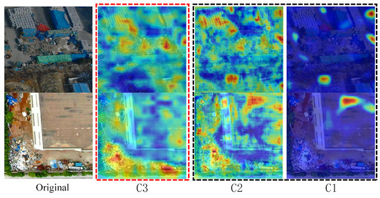 Figure 4. As illustrated in the figure, the attention matrix of C3, compared to C1 and C2, more accurately captures the positions of the garbage objects in the original image. As the network layers go deeper, the extracted features progressively transition from low-level details to high-level semantic representations, allowing for a holistic characterization of the shape and structure of urban garbage objects. Moreover, deeper feature representations offer enhanced robustness against interference, as background noise is incrementally suppressed, allowing the CA module to concentrate more on regions pertinent to garbage targets. Furthermore, the CA module allocates spatial attention across both width and height dimensions, capturing fine-grained spatial variations, thereby enhancing its ability to accurately localize the targets. The neck component of YOLOv5 facilitates a multi-scale integration of both global and local information and helps the CA module to capture multi-scale features of objects in complex environments. Consequently, the C3 module precisely localizes urban garbage targets.