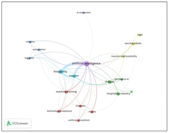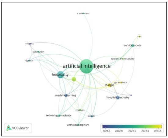 In the searches, more than 719 papers were found. We selected keywords with a minimal number of occurrences higher than five. At the beginning of the research period, the scientific focus was on the hospitality industry and technological improvement underlined by the following keywords (machine learning, robotics, robot, and automatization), marked as bluish colors (Figure 1). These results were expected, as the hospitality sector is highly dependent on human resources. Our research revealed that the central node was artificial intelligence with the highest importance, but colored yellow-green, which, according to the scale, can be seen that it was among the most novel themes (Figure 2). Furthermore, generative AI, ChatGPT, and trust were the top keywords in the novel articles published in 2023. Thus, the improving hospitality sector by implementing AI is equally important for scientists as management practitioners, while ensuring full consideration of relevant policies and human rights, with a focus on trust.