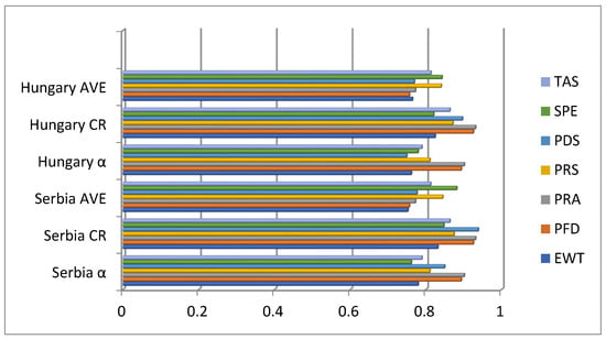 The values for different model selection criteria were mostly similar between the two samples, though there were some differences that indicated slight variations in model fit between Serbia and Hungary. For the EWT construct, one can observe that the AIC and BIC criteria differed, suggesting that a particular model might fit the data slightly better in one sample than in the other. Similar variations were noted for other constructs, but overall, the differences were relatively minor, indicating the stability of the models across both samples. The PDS construct showed significantly higher AICc values in both samples, suggesting that this criterion favors more complex models. A similar pattern was observed for the SPE and TAS constructs, where AICc values were higher in both samples, though they remained comparable between Serbia and Hungary (Figure 6).