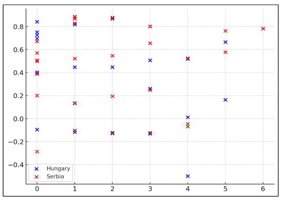 The fit summary for both the Serbian and Hungarian samples demonstrated excellent model fit to the data []. For Serbia, the SRMR (<0.08) was 0.021 and the NFI (≥0.90) was 0.985, while for Hungary, the SRMR was 0.005 and the NFI was 0.993. Both samples showed acceptable values for d_ULS (lower values are preferable) (Serbia: 0.017, Hungary: 0.073), d_G (lower values are preferable) (Serbia: 0.051, Hungary: 0.046), and chi-square (X2 < 3, df = 10, p > 0.05) (Serbia: 1.426, Hungary: 2.671), further confirming the model’s validity in both cases.