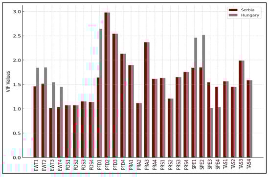 All statistical analyses were conducted using software tools such as SPSS 23.00 and SmartPLS 4, which provide precise data analysis and model validation. After collecting survey responses, the data underwent a cleaning process to ensure accuracy and consistency. This process involved checking for incomplete or invalid responses as well as identifying and removing any outliers that could affect the validity of the results []. After cleaning, the data were analyzed using appropriate statistical methods, including descriptive statistics to review the basic characteristics of the sample and to check data distribution []. Techniques such as exploratory factor analysis were employed in this study to determine the validity and reliability of the constructs used in the questionnaire. The data processing results showed that all data were within normal distribution ranges, with skewness and kurtosis values falling within acceptable limits, confirming the data’s validity for further analysis []. For the Serbian sample, the Cronbach’s alpha coefficient for the entire questionnaire was 0.911, indicating high internal consistency of the scales (α ≥ 0.70). For the Hungarian sample, the calculated Cronbach’s alpha was 0.857, also indicating satisfactory reliability of the questionnaire. Further analysis included the assessment of composite reliability (CR ≥ 0.70) and average variance extracted (AVE > 0.50) for each construct, with all values exceeding the recommended thresholds (CR > 0.70, AVE > 0.50), confirming convergent validity. Structural equation modeling (SEM) was also used to analyze the interrelationships among constructs and to assess the overall model []. The SEM analysis revealed that all models were well fitted, with satisfactory fit index values.