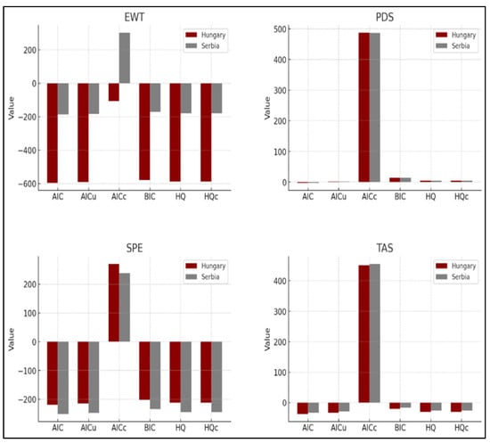 Based on the presented graphs, it can be observed that the values of model selection criteria (AIC, AICu, AICc, BIC, HQ, HQc) for both countries were within acceptable limits, indicating model stability. Although there were variations between Hungary and Serbia, these differences were expected and did not deviate significantly from significance thresholds. The models for both countries showed similar patterns in the criterion values, suggesting consistency in the applied model selection methods.