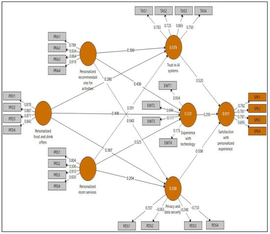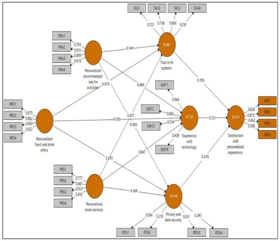 Based on the model shown in the figure, the R² value for satisfaction with personalized experiences (SPE) was 61.1%, indicating that a significant portion of the variance in satisfaction was explained by personalized services, trust in AI systems, experience with technology, and the perception of privacy and data security. The model also demonstrated that trust in AI systems had a strong direct impact on satisfaction (β = 0.520), while personalized activity recommendations and room services had a mediating effect through experience with technology and trust in AI. Although privacy and data security were important, their indirect impact was somewhat smaller compared to the other mediating variables (Figure 7). In the displayed SEM (Structural Equation Model) diagram, the arrows represent relationships between latent constructs. Straight arrows indicate causal relationships between constructs, with numbers showing path coefficients, i.e., the strength and direction of influence. Higher coefficient values indicate stronger relationships. Arrows from constructs to individual items represent the measurement model, where the numbers indicate factor loadings, showing how well each item reflects the corresponding construct.