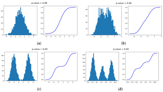 Figure 1 illustrates examples of unimodal and multimodal datasets in terms of pdf plots (histograms) and ecdf plots. The p-values provided by the dip-test are also presented above each subfigure. In Figure 1a a unimodal dataset generated by a Gaussian distribution is illustrated along with the corresponding p-value . p-values close to 1 indicate unimodality and this is also evident in that case. In contrast, Figure 1b presents a dataset generated by two close Gaussian distributions which does not clearly constitute a unimodal or multimodal dataset. This uncertainty is indicated by the computed p-value of 0.08, which is closer to 0. In this case, the significance level defined by the user plays a crucial role in determining unimodality. For example, if the significance level is set to , then a p-value less than leads to the dataset being determined multimodal. However, with significance levels of or , the dataset would be considered unimodal. In Figure 1c,d two strongly multimodal datasets are shown, with two and three peaks, respectively. The p-value is 0 in both datasets, and the test decides multimodality regardless of the significance level chosen by the user.