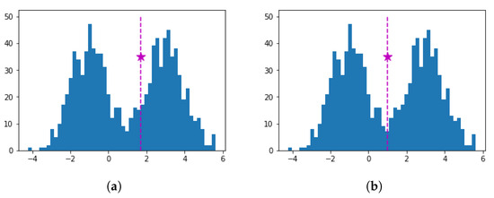 Histogram of a bimodal dataset along with its split threshold (star). (a) The split threshold was computed without utilizing the separation criterion. (b) The split threshold was computed taking into account the separation criterion.