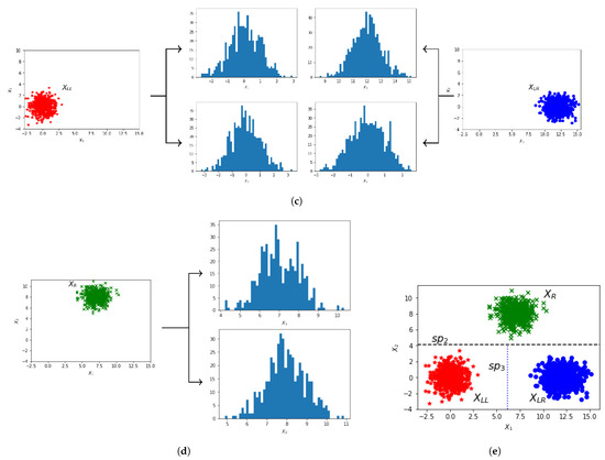 Stepwise partitioning of a 2-D dataset (X) into axis unimodal rectangular regions. (a) 2-D plot of the original dataset X, with histogram plots of each feature, the obtained split points, and the resulting 2-D plot illustrating X split (by ) into two clusters (, ). (b) 2-D plot of , with histogram plots of each feature, the obtained split point, and the resulting 2-D plot illustrating split (by ) into two clusters (, ). (c) 2-D plots of and , along with the unimodal histogram plots of each feature. (d) 2-D plot of , along with the unimodal histogram plots of each feature. (e) Final 2-D plot of X, illustrating the final split points () that partition X into three axis unimodal clusters ().
