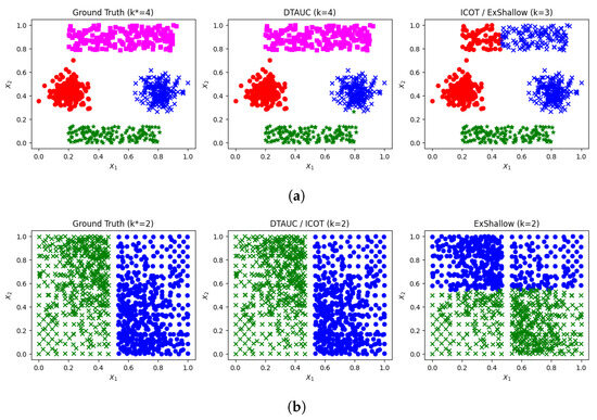 Another dataset to be discussed is Synthetic I, a three-dimensional dataset where feature vectors and were generated using two Gaussian distributions and two uniform rectangles, and was generated using a uniform distribution. A 2-D plot of Synthetic I, with axes representing features and , is provided in the left plot of Figure 6a. It should be noted that since feature is uniformly distributed it does not contribute to the splitting process. This dataset is separated by axis-aligned splits; however, the ICOT and ExShallow methods fail in this task. As shown in Figure 6a, ICOT fails to estimate the correct number of clusters ( instead of the actual ) (right plot), while the partition obtained by DTAUC (middle plot) is successful. The 2-D plot of the ExShallow solution is almost identical to the ICOT plot (right plot in Figure 6a).
