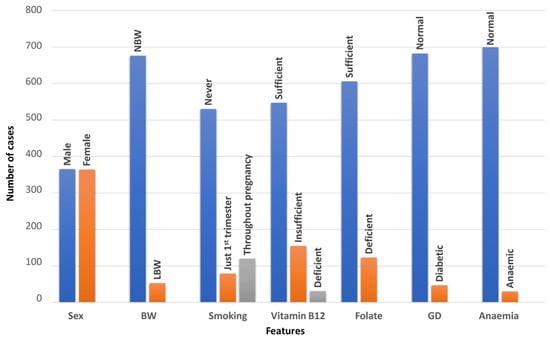 Bar chart for neonate gender (sex), BW and mother’s smoking pattern during pregnancy, maternal vitamin B12 status, maternal plasma folate status, gestational diabetes mellitus, maternal anemia.
