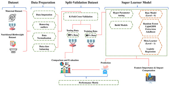 Consequently, this work addresses the challenges of achieving better performance and results from ML models for BW prediction. To enhance ML results, we explore the potential benefits of an ensemble learning approach, which combines multiple single models to improve prediction performance and generalizability [25]. The main objective of this study is to identify the most suitable ensemble learning algorithm, including single-base models and the super learner (SL) model, and determine the optimal combination of single-base models for predicting BW class (LBW or normal BW (NBW)). We aim to investigate the contributions and effects not only of commonly used factors such as fetal sex, GDM, GA at the time of blood draw, and smoking but also maternal nutritional factors, such as vitamin B12 and folate status and anemia. Our findings, derived from the SL and single-base models, shed light on the critical role of important clinical factors associated with adverse pregnancy outcomes and inadequate BW (<2500 g). To the best of our knowledge, this is the first study to use ML models and an ensemble learning for BW prediction, incorporating a diverse range of clinical nutritional factors, such as maternal vitamin B12, folate, and anaemia, as well as common physiological and lifestyle factors such as fetal sex, GDM, GA and smoking. The data for all of these attributes were collected between 24 and 27 GWs. Consequently, the main contributions of this work are as follows: