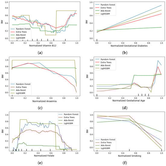 The partial dependency plots (PDP) have been used to uncover hidden patterns and understand the significance of maternal features such as fetal sex, vitamin B12 and folate status, GA, GDM, smoking, and anemia that influence a neonate’s BW. The PDP shows how the BW changes as the particular feature’s value changes while holding other features constant. As shown in Figure 6a, we found a significant negative association between maternal vitamin B12 maternal vitamin B12 status and neonatal weight, as babies born to mothers with low status of vitamin B12 had NBW. This may reflect maternal–fetal vitamin B12 transfer to meet fetal requirements at the expense of maternal requirements. While lower BW with increasing maternal vitamin B12 status was observed, a sharp spike in BW when maternal vitamin B12 status was high suggested that replete maternal vitamin B12 status is also associated with NBW. The medium level of maternal vitamin B12 can cause LBW, as found in this study and Figure 6a.