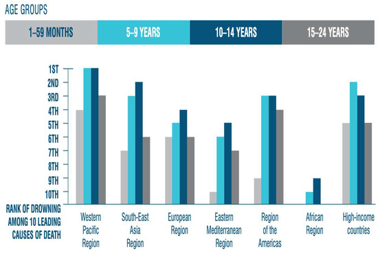 Global distribution of drowning as a leading cause of death by age group and region [2].