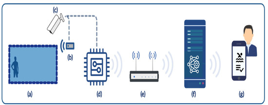 Overview of the system proposed by Alotaibi [40]: (a) swimming pool, (b) motion-detection sensor, (c) overhead camera, (d) Raspberry Pi 3, (e) router, (f) server station used to process captured images by using process transfer learning, and (g) mobile alarm application.