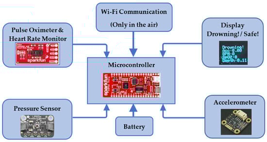 Jalalifar et al. [45] suggested a waterproof wearable drowning detecting system based on heart rate, blood oxygen saturation, water depth/pressure, and acceleration sensors. A microcontroller processes the data and compares it to adjustable pre-defined threshold values. If an observed value exceeds the corresponding threshold for a certain period, a “Drowning” message appears on the display. Furthermore, the board is Wi-Fi enabled, allowing it to transmit signals to a specific IP address that can be accessed via a cell phone or a laptop. Figure 4 depicts the general block diagram of the system.