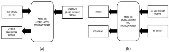 Heart rate drowning system functional diagram: (a) transmitter module; (b) receiver module.