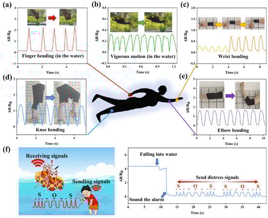 (a) Relative resistance variation in water when the sensor was mounted on the swimmer’s finger. (b) Resistance variation of a sensor mounted on a diver’s leg during rapid movement underwater. Sensor mounted on (c) wrist brace, (d) knee brace, and (e) elbow brace to monitor joint movement at different bending angles. (f) Resistance variation of FWAS for accidental fall into water [49].