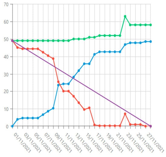 In Figure 1, the burndown chart monitors the work pace by emphasizing the remaining time (measured in hours). This chart is commonly used to track project Sprints, although the time range may vary. In the figure, the red line represents the burndown chart. At the same time, the blue line shows the burnup chart and the green line shows the evolution of the total estimated time. In this way, extra information complements the burndown chart.