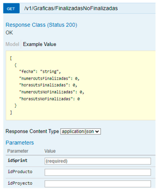 A JSON object is returned and provides relevant data for the chart, such as time, type, and date. It is necessary to specify the SprintId, ProductId, and ProjectId to access the method that provides data for the completed vs. not completed work chart (see Figure 4). Subsequently, a JSON object is retrieved, and relevant data for the chart are provided, including the number of completed UTs, not completed UTs and the date.