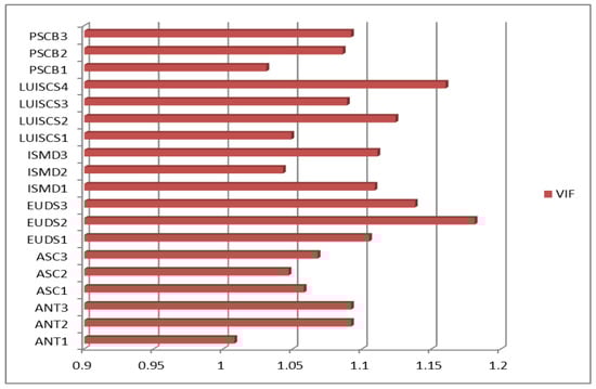 In SmartPLS, the PLS algorithm was applied for structural model analysis. The Fornell–Larcker criterion was used to verify that all average variance extracted (AVE) values exceeded 0.5, confirming satisfactory convergent validity. Furthermore, the AVE values were greater than the intercorrelations among latent variables, which confirmed adequate discriminant validity. The evaluation of model fit showed that all indicators were within acceptable ranges, with SRMR (0.013) and NFI (0.976) indicating a high level of model fit. Additionally, the VIF values for the manifest variables were below 5 (ranging from 1.008 to 1.181), indicating the absence of multicollinearity among variables [60] (Figure 1).