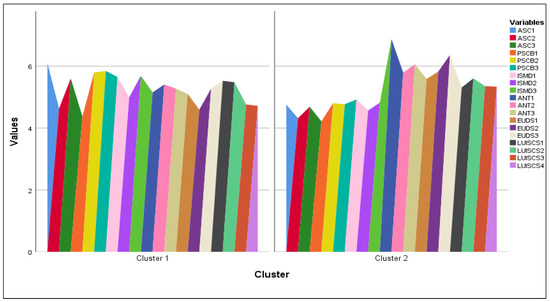 The chart illustrates the differences between two clusters regarding key variables related to smart city solutions. Respondents in Cluster 1 generally display moderate values for most variables, with particularly lower scores for awareness of smart cities (ASC) and the perception of smart city benefits (PSCB). In contrast, Cluster 2 exhibits higher values across nearly all variables, indicating a greater level of engagement in the use of digital services (EUDS) as well as higher acceptance of new technologies (ANT). These results suggest that respondents in Cluster 2 are better informed, more engaged, and more inclined to adopt and integrate smart city solutions compared to those in Cluster 1 (Figure 3).
