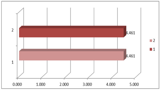 Figure 4 displays the distances between the two clusters, with both groups (1 and 2) showing identical distance values of 4.461. This suggests that the clusters are significantly separated, indicating a clear distinction between these groups in the context of the analyzed variables [52]. The different clusters likely represent substantially different profiles of respondents or entities in the study. The distance of 4.461 indicates a certain degree of separation between the two clusters, but since the distance values are identical for both clusters, it suggests that this difference is symmetrical in both directions.